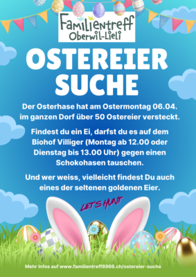 Sucht die rund 8 cm grossen Eier überall. Wer ein Ei gefunden hat, darf dieses am Montag von 12.00 Uhr bis 18.30 Uhr oder am Dienstag von 08.00 bis 13.00 Uhr auf dem Biohof Villiger beim Wohnhaus „Kennel“ gegen einen kleinen Schokohasen tauschen. Klingeln zu den angegebenen Zeiten bei Isabelle Kennel.